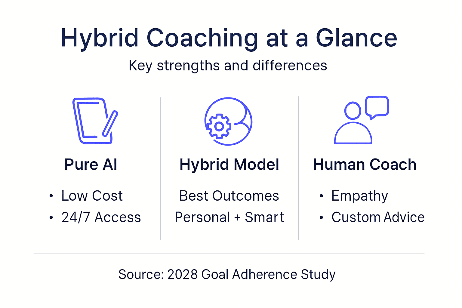 Hybrid coaching balances AI's automation and 24/7 availability with human empathy and adaptive problem solving, achieving 25% to 30% better goal adherence. Pure AI coaching costs less but lacks emotional connection, while pure human coaching provides personalization but struggles with scalability and consistent availability. The hybrid model delivers the best of both approaches.