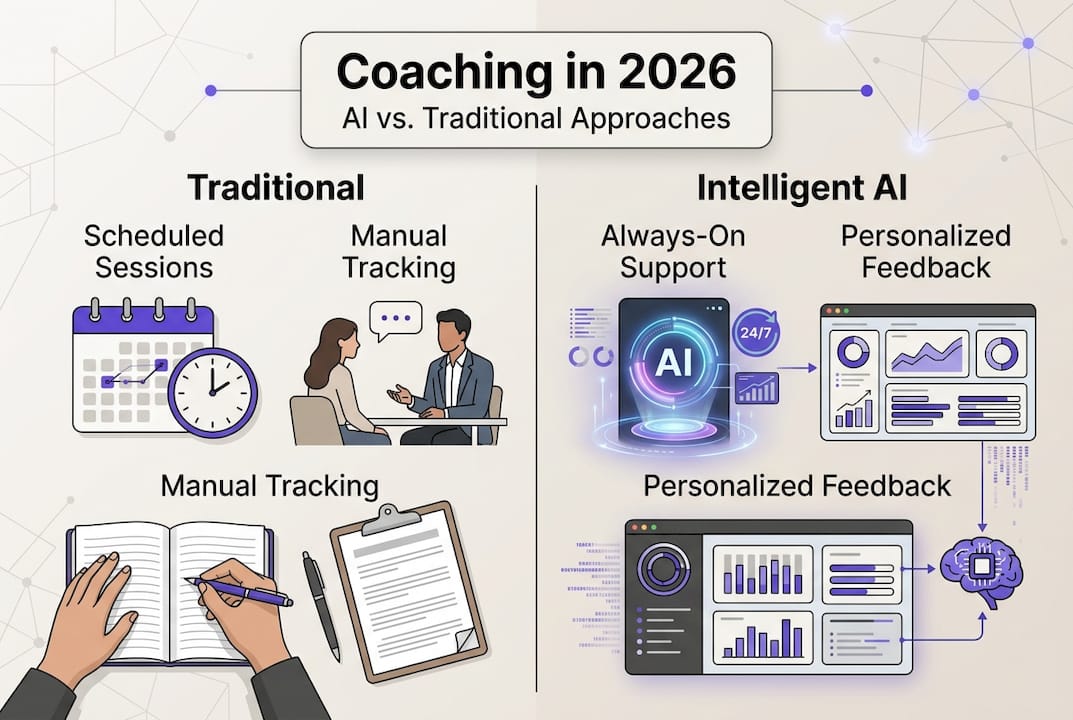 Intelligent coaching support uses AI to deliver real-time, adaptive guidance continuously, while traditional coaching relies on scheduled sessions and human interpretation. The key difference is availability and speed of feedback.