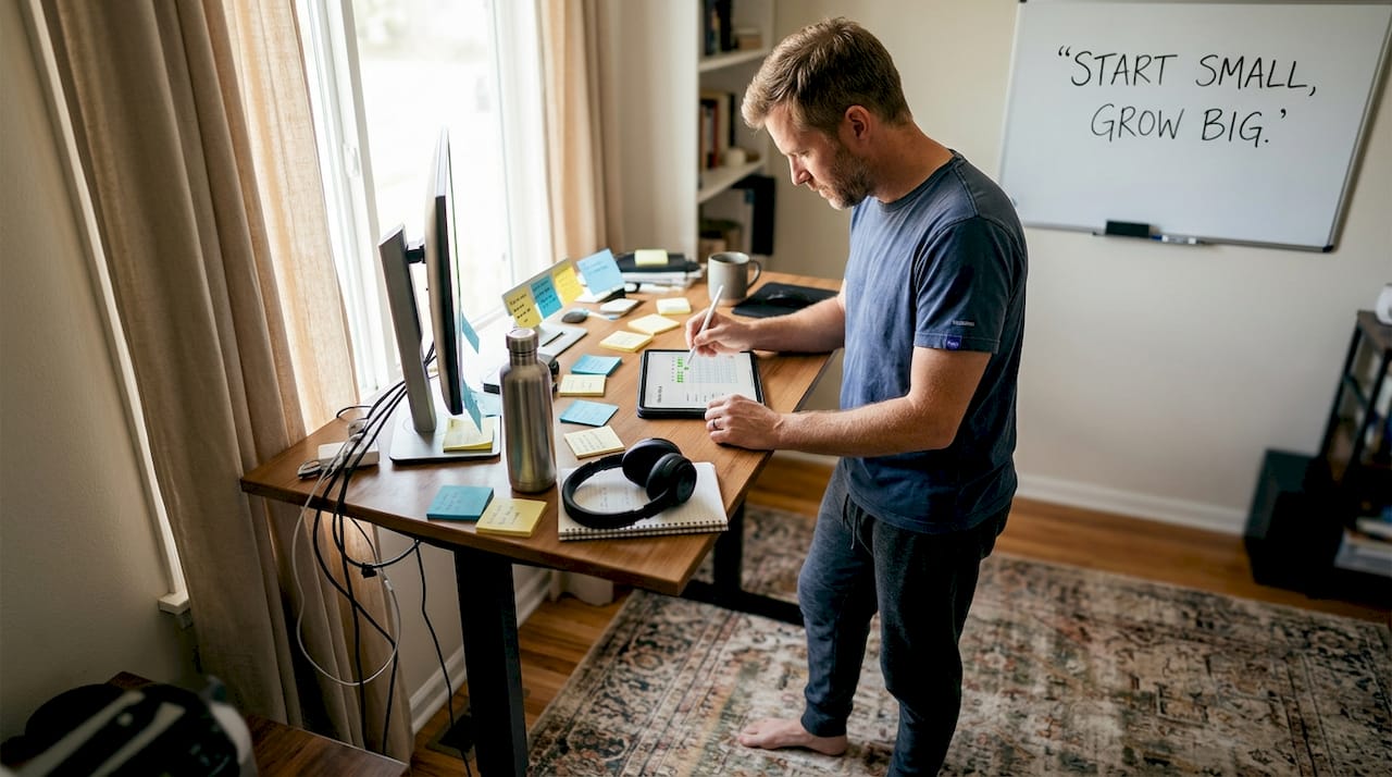 Start with one micro-habit taking five minutes or less, anchored to something you already do daily. Use implementation intentions by creating an if-then plan, and consider adding self-improvement strategies with AI accountability to maintain consistency without adding planning time.