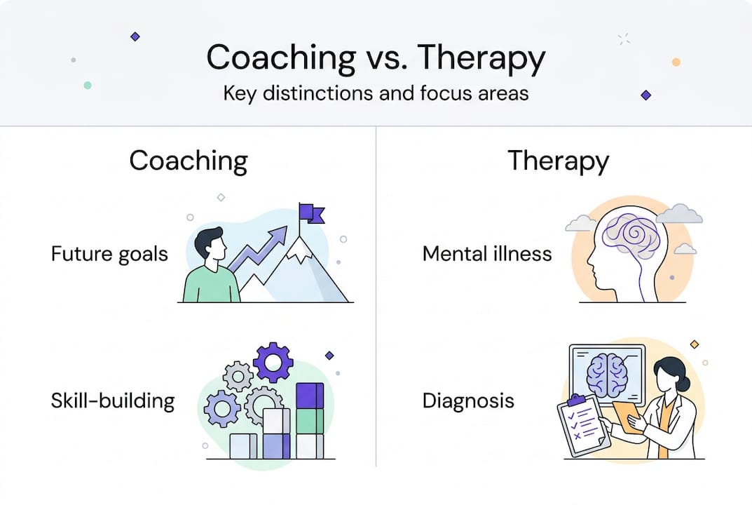 Mental well-being coaching and therapy serve complementary but distinct roles in supporting mental health. Coaching is future-oriented and non-diagnostic, focusing on goal achievement and skill development. Therapy addresses clinical disorders through evidence-based treatments, often exploring how past experiences shape current struggles. Understanding these boundaries helps you choose the right support for your needs.