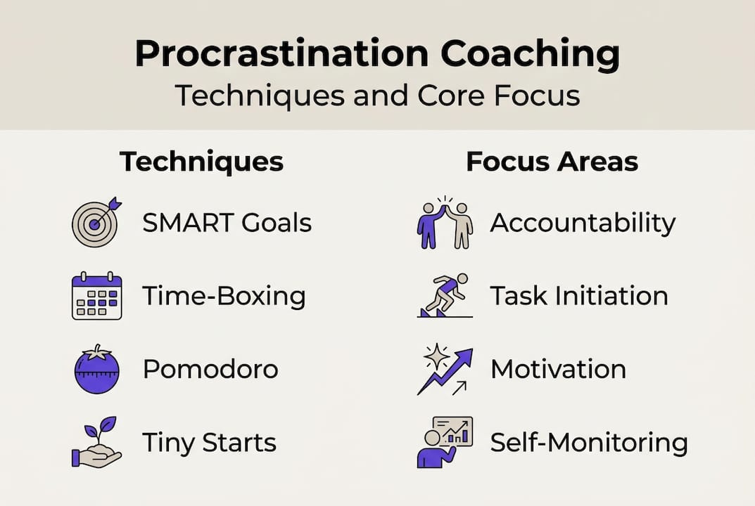 | Core techniques | Coaching combines diagnosing drivers, SMART goal setting, time management methods like Pomodoro, behavioral activation, cognitive restructuring through CBT and motivational interviewing, environment redesign, and weekly accountability. |